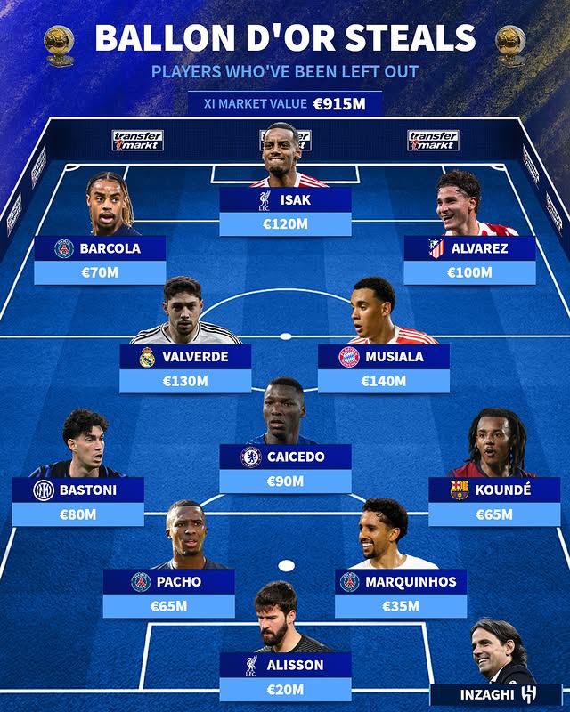 笃定如下:门将:阿利松(利物浦)——2000万欧元后卫:巴斯托尼(国外米兰)——8000万欧元帕乔(巴黎圣日尔曼)——6500万欧元马尔基尼奥斯(巴黎圣日耳曼)——3500万欧元孔德(巴塞罗那)——6500万欧元中场:巴尔韦德(皇家马德里)——1.3亿欧元穆西亚拉(拜仁慕尼黑)——1.4亿欧元凯塞多(切尔西)——9000万欧元时尚:巴尔科拉(巴黎圣日耳曼)——7000万欧元伊萨克(利物浦)——1.
