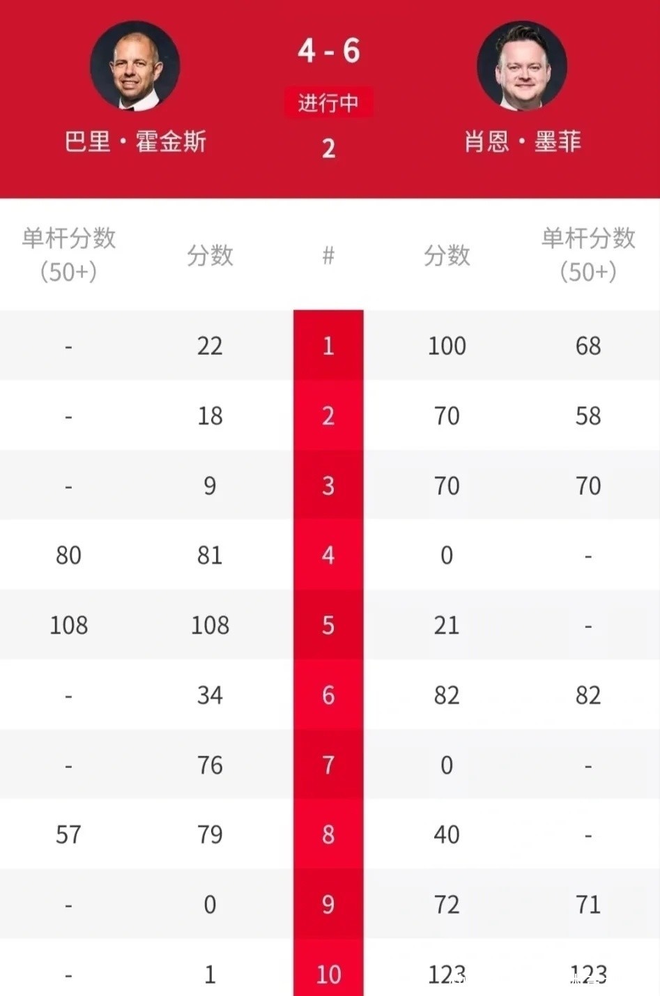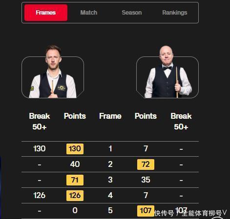 来到本次球员锦标赛,他在首轮以6-4淘汰巴里-霍金斯,晋级八强后,墨菲在采访中示意:“近几个月来我一直念念着要确保我方的世锦赛种子席位,我早就执意到了这是个问题……”。可惜到了1/4决赛,墨菲靠近特鲁姆普居然以0-6被横扫。而特鲁姆普在晋级四强之后体育录像/图片,半决赛迎战4届世锦赛冠军的“巫师”希金斯,他在前六局取得4-2跳跃上风。