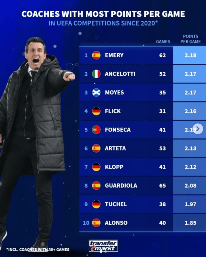 虎扑01月23日讯德国转会市集统计了自2020年以来,欧战赛事场均取得积分最多的训诲员(至少握教30场欧战赛事):