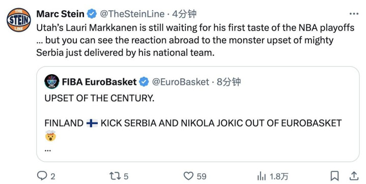 有名媒体东谈主Marc Stein写谈:“有他爵士队的马尔卡宁已经在恭候他的生存初度季后赛之旅,然而你们不错看到大家关于他的国度队打败塞尔维亚队的反馈!”